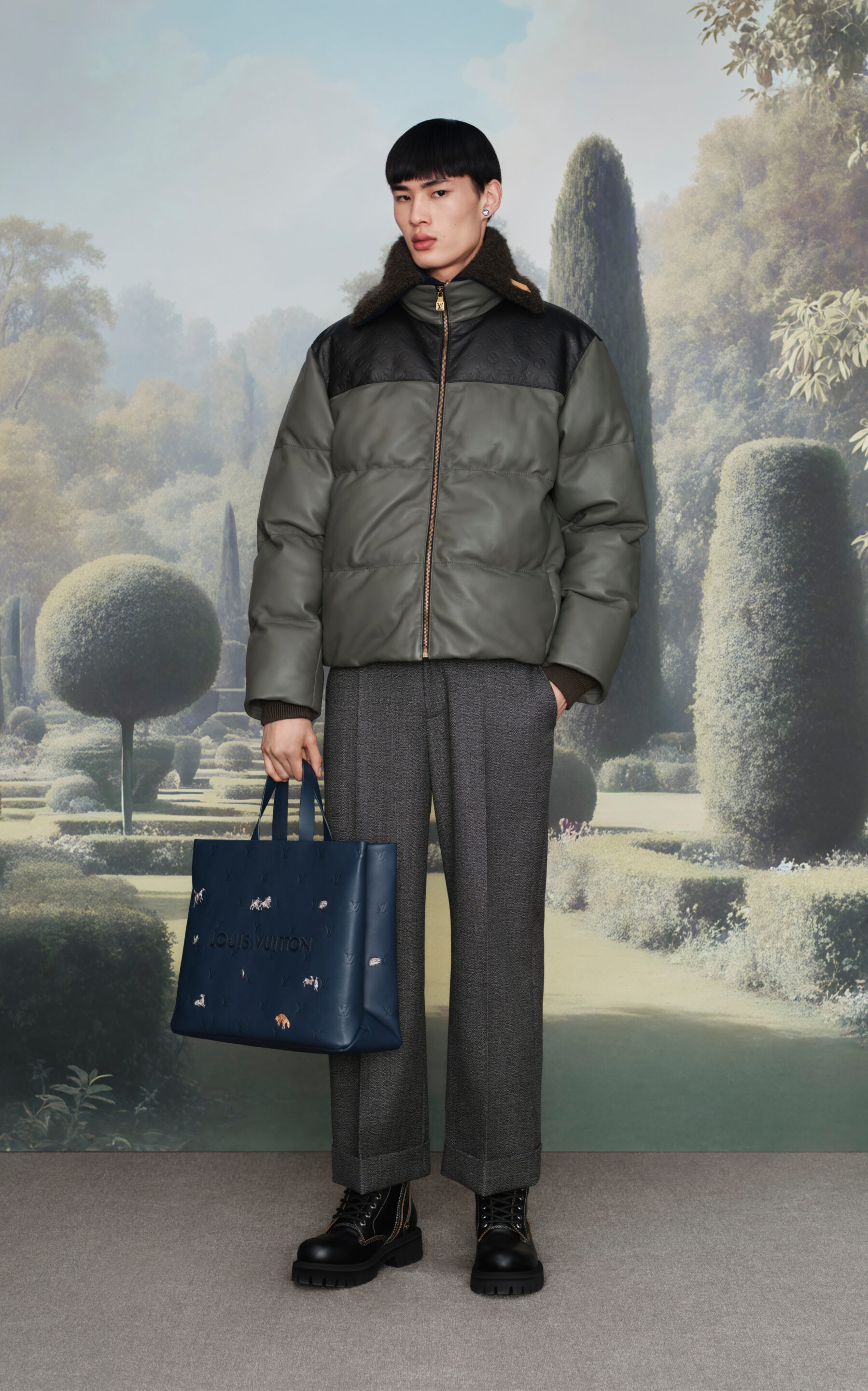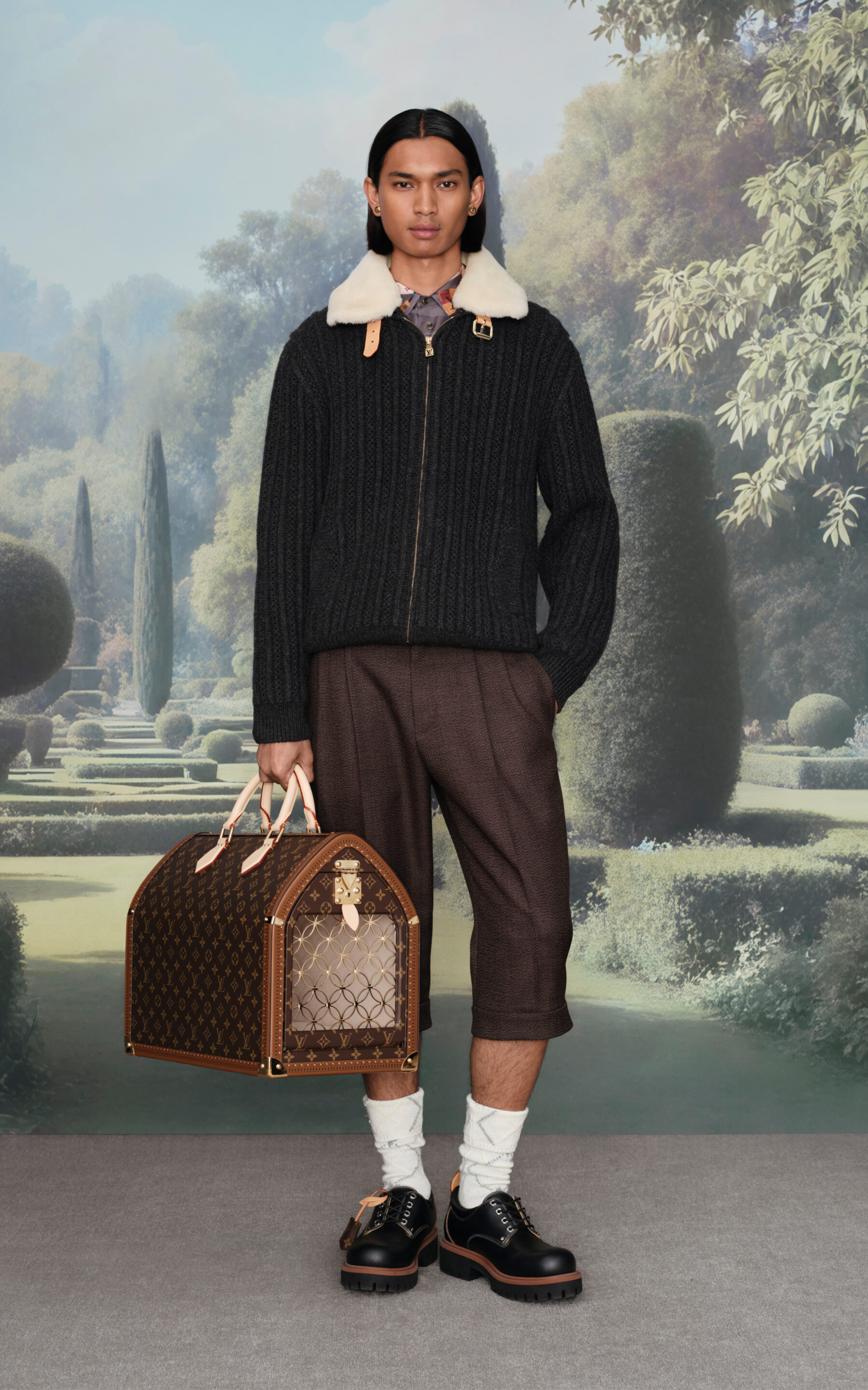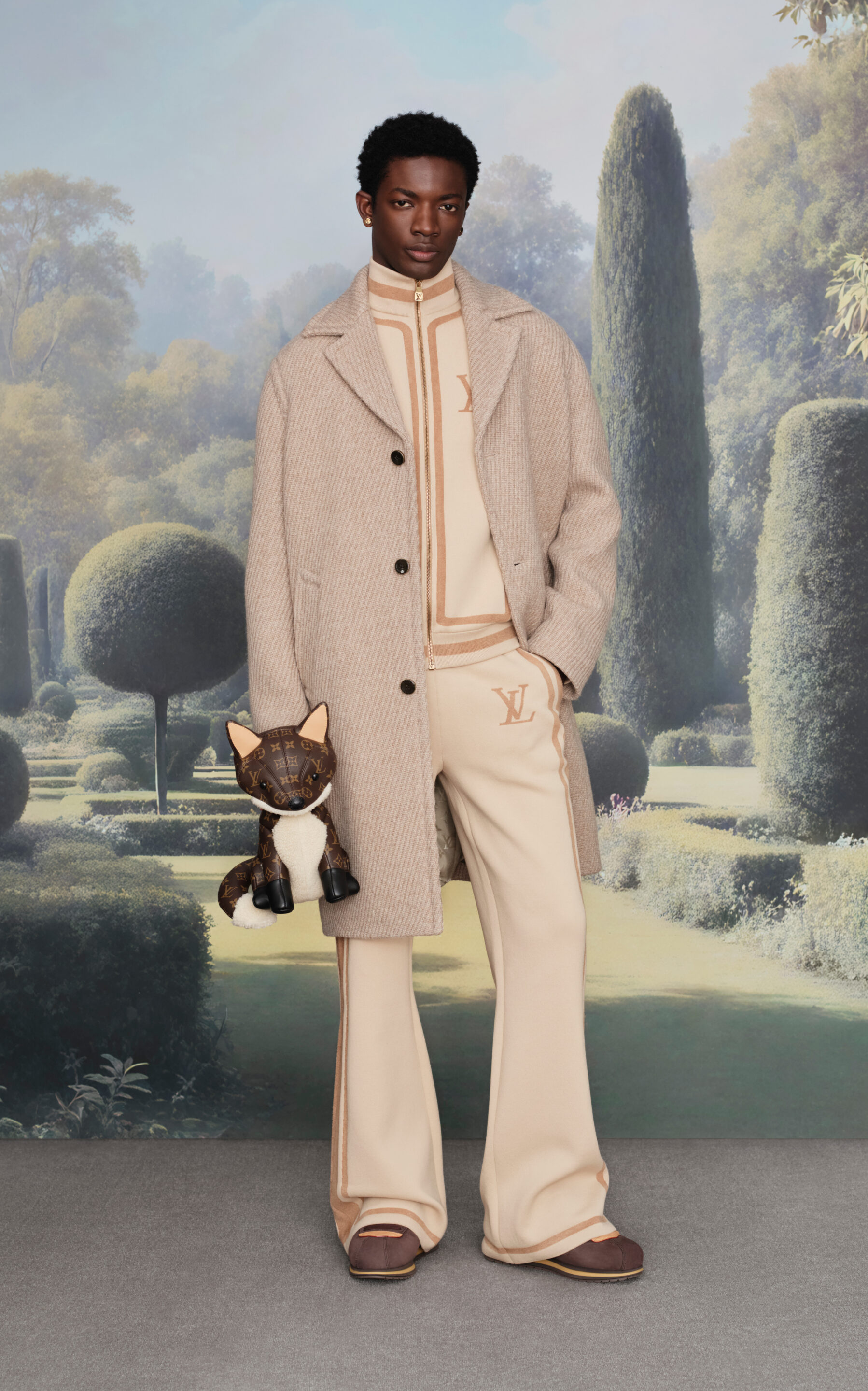 En accesorios, los bolsos adquieren protagonismo absoluto, desde reinterpretaciones de clásicos como la Keepall hasta excentricidades lúdicas como un bolso en forma de cachorro Beagle de tamaño real. Los zapatos, por su parte, exploran desde mocasines sobredimensionados hasta sneakers de inspiración skate y botas de combate reinterpretadas, reflejando el eclecticismo refinado que define esta entrega.