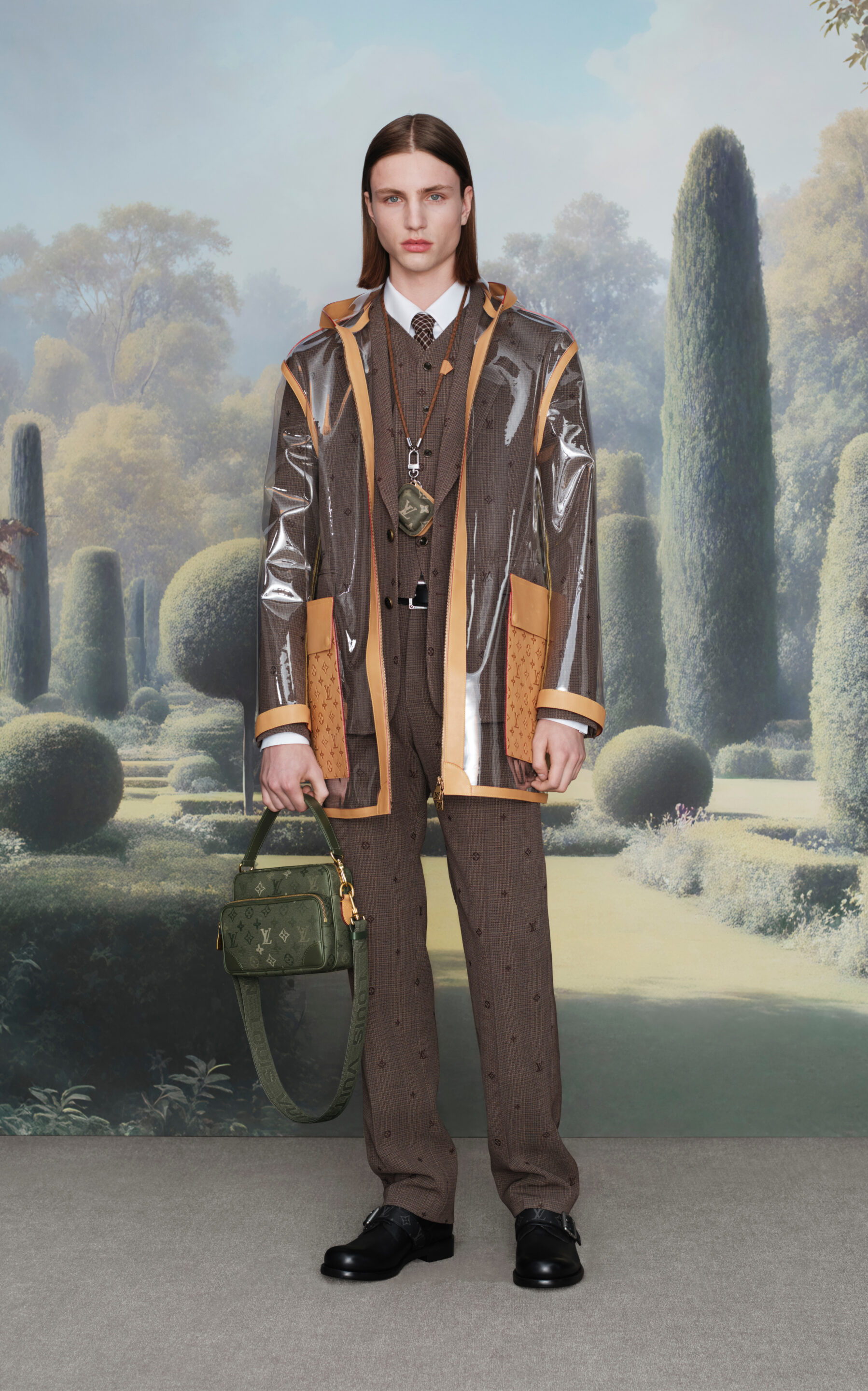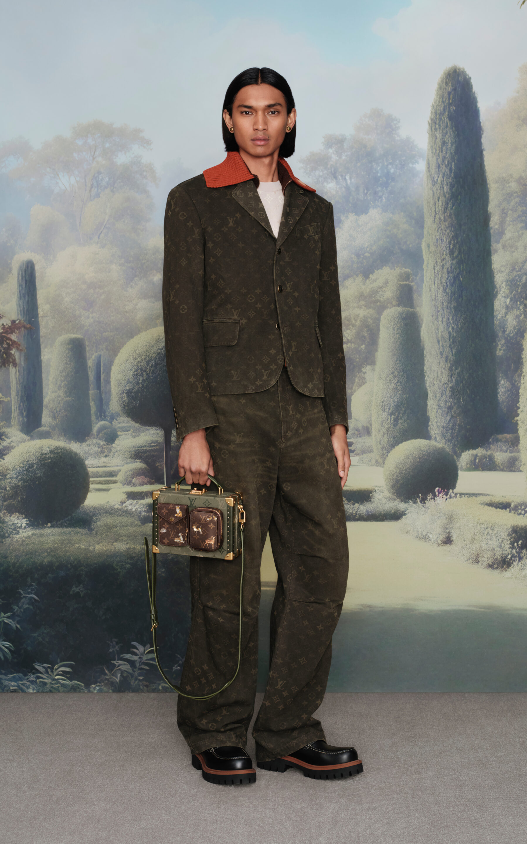 Pharrell convoca al dandy moderno para sumergirse en una narrativa de contrastes: el encanto del aire libre y la sofisticación de las mansiones campestres dialogan en un vestuario que oscila entre la tradición y la osadía. Destaca la introducción del Monogram Surplus, un nuevo estampado inspirado en el camuflaje rural, plasmado en prendas, accesorios y hasta en artículos de glamping como tiendas y sacos de dormir, consolidando un lenguaje visual que fusiona naturaleza y lujo.