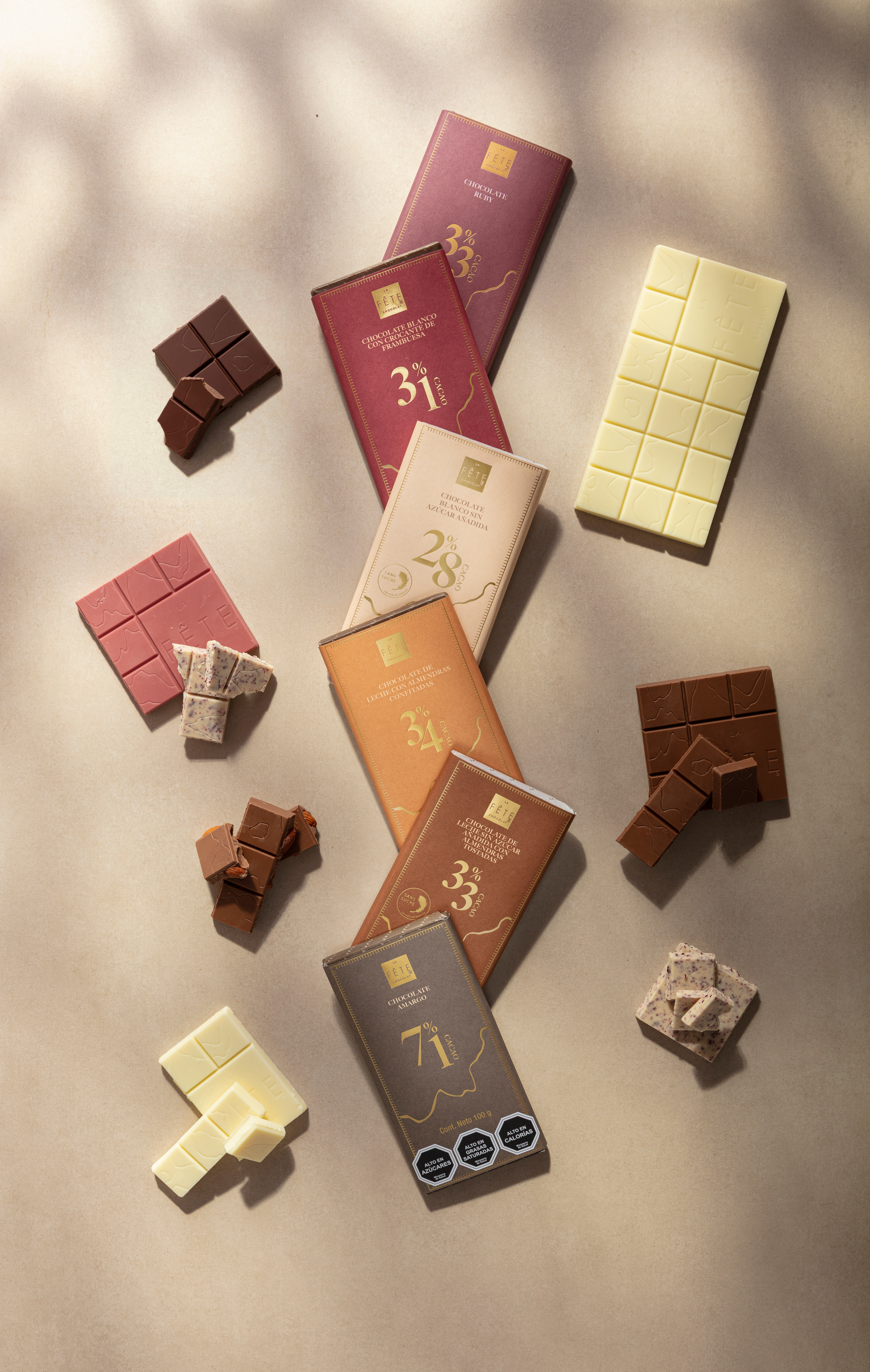 La Fête Chocolat presenta una evolución natural de uno de sus formatos más emblemáticos. Sus clásicas barras se renuevan a través de un diseño más claro y expresivo, que pone en primer plano lo esencial. El porcentaje de cacao se convierte en el protagonista visual, permitiendo reconocer de inmediato la intensidad y el carácter de cada variedad. Una propuesta que simplifica la elección y refuerza la idea de calidad desde el primer gesto.