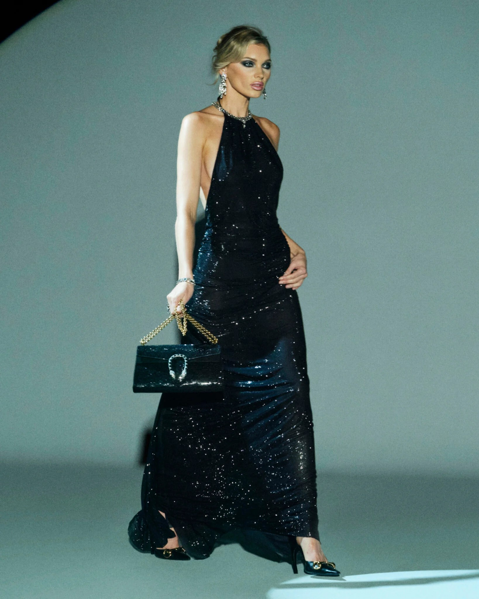 El punto de partida es claro, es utilizar Gucci como suma de eras, sensibilidades y códigos que no se anulan entre sí. El glamour afilado de Tom Ford, la feminidad depurada de Frida Giannini y la fantasía maximalista de Alessandro Michele conviven en un mismo plano como capas superpuestas. Demna reorganiza el archivo y lo reinterpreta con la finalidad de crear su propio lenguaje estético dentro de la casa. Y en ese gesto, más curatorial que decorativo, empieza a perfilar su propia gramática dentro de la firma florentina.