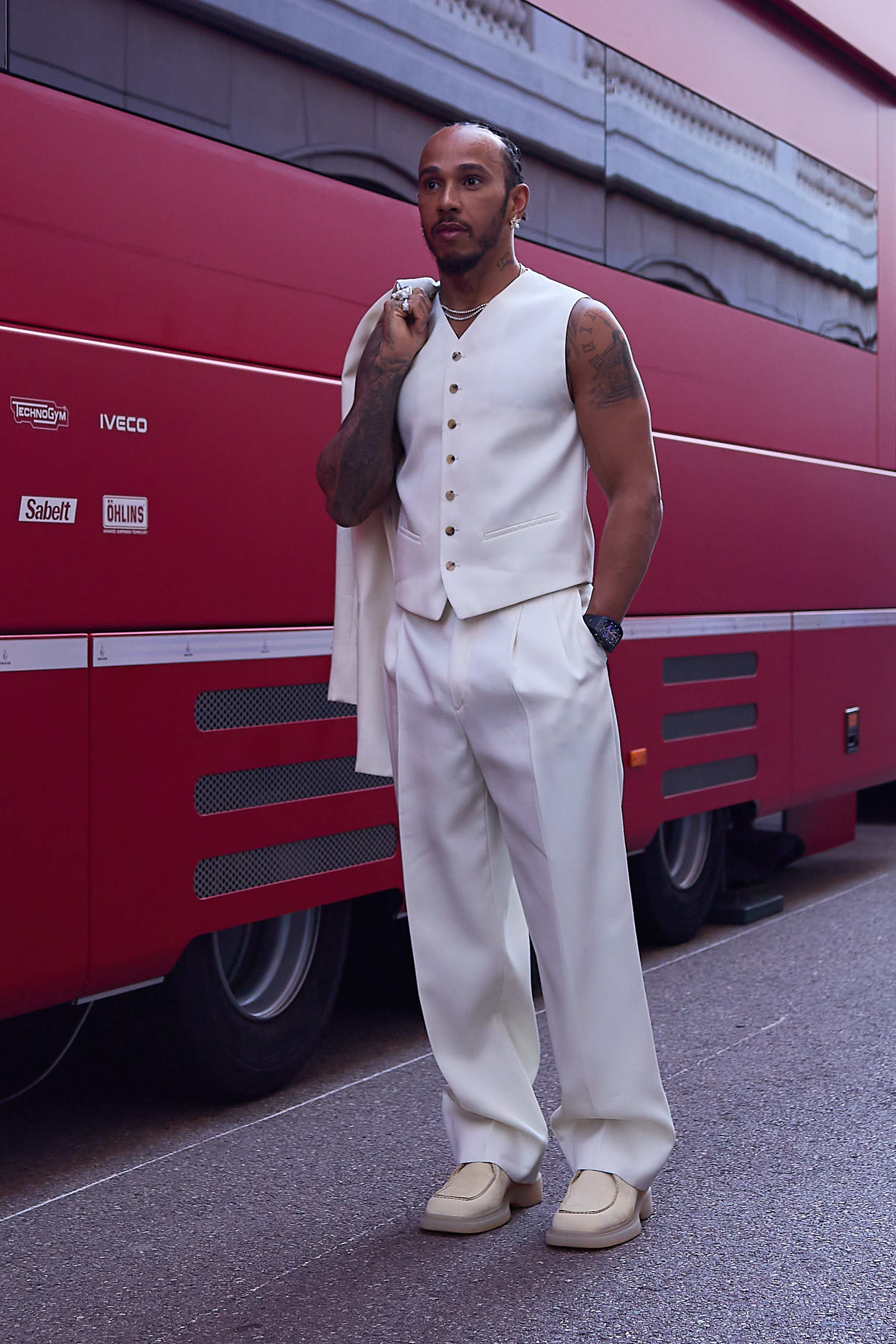 La firma estadounidense vistió al piloto británico con un traje blanco perla hecho a medida, protagonizado por una chaqueta de lana oversize sin cuello, reafirmando la estrecha relación entre el lujo moderno y el universo deportivo.