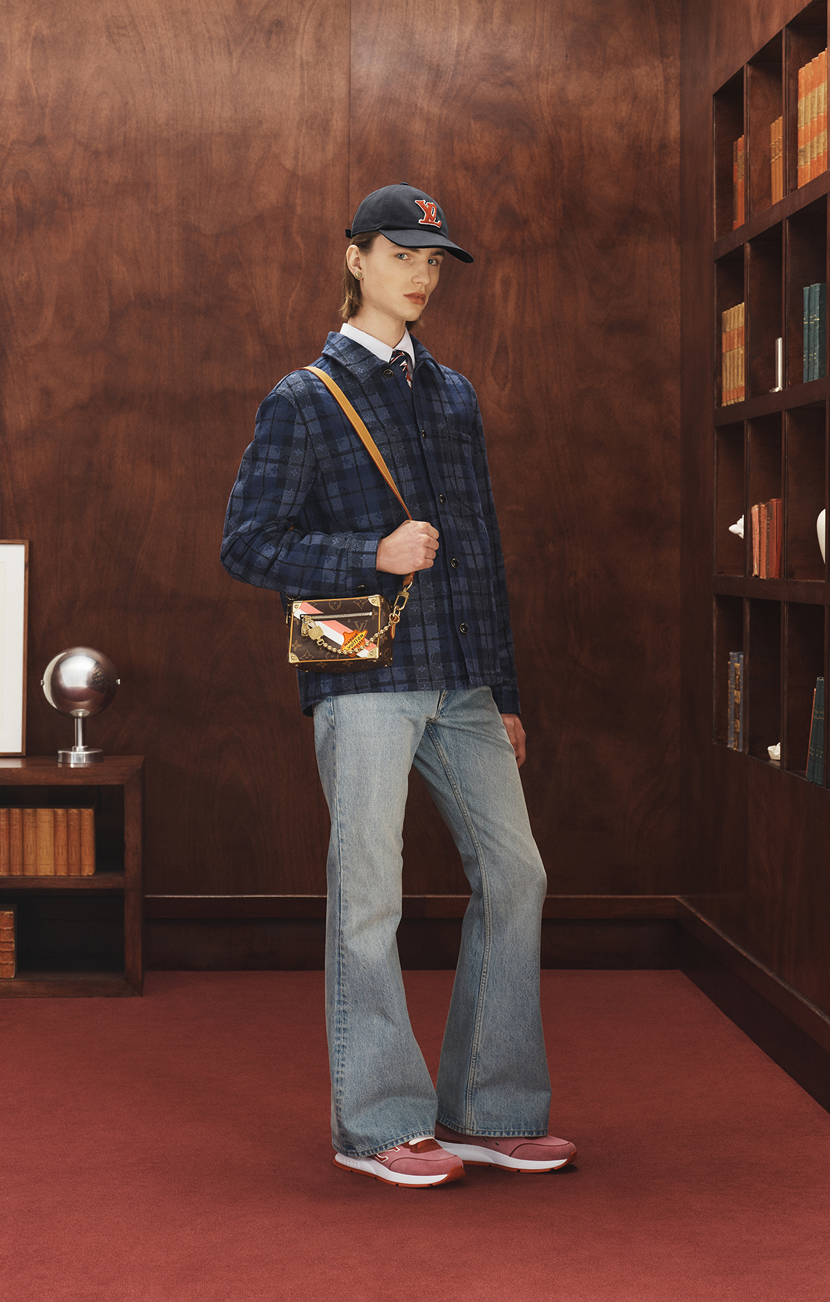 Los accesorios refuerzan el espíritu Ivy League con corbatas, bufandas, gorras y cinturones bicolor, además de gafas LV Slide de inspiración deportiva y joyería LV Club en plata esterlina. El calzado equilibra tradición y modernidad con el LV Oxford loafer en piel de becerro con construcción Blake, las reinterpretaciones del LV Remix (botines, boat shoes y Mary-Janes) y las nuevas versiones de los icónicos LV Classic sneaker y LV Trainer.
