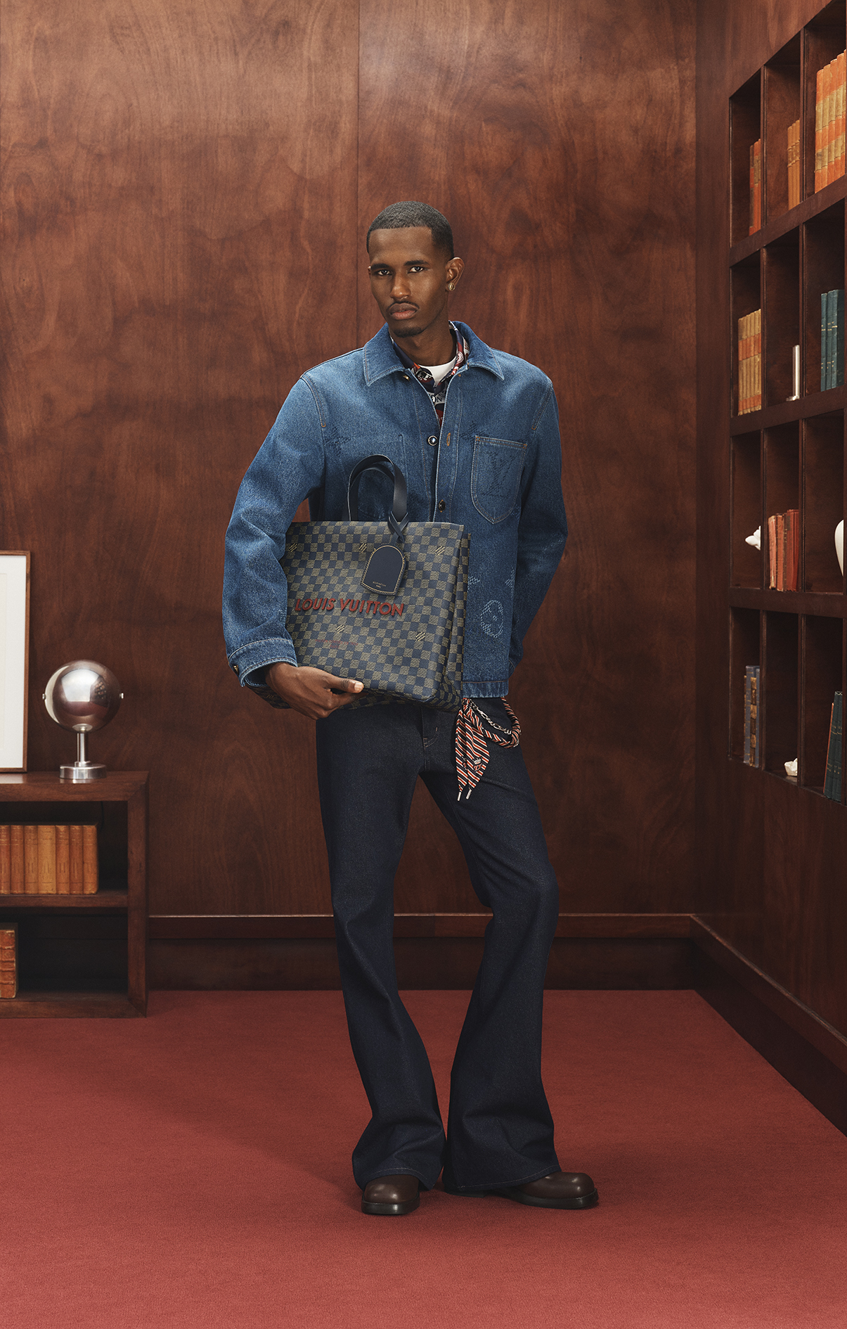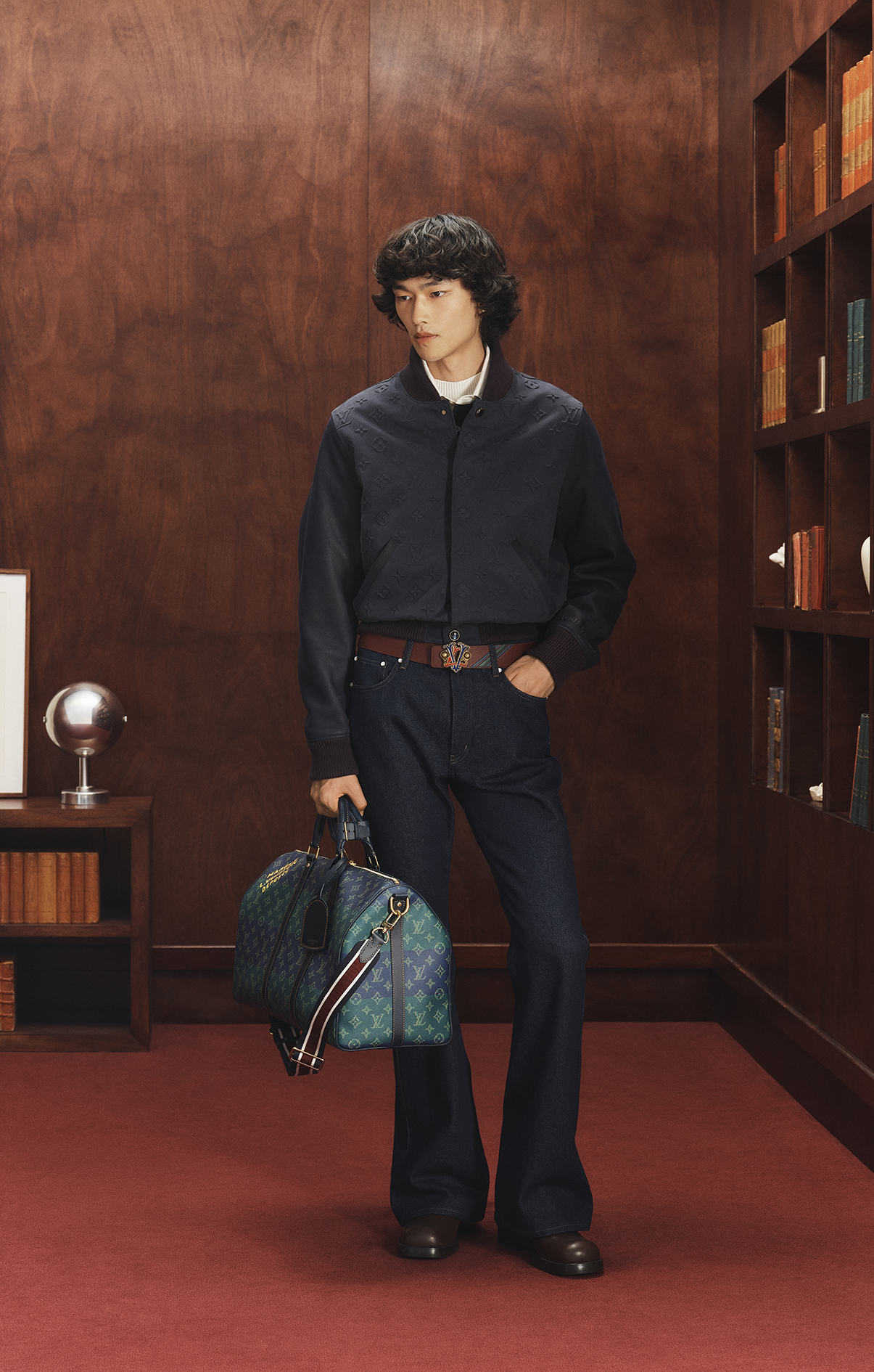 La colección destaca por la sofisticación de su sastrería preppy, piezas en cuero y knitwear con insignias universitarias, así como prendas deportivas de inspiración varsity trabajadas con el savoir-faire característico de Louis Vuitton. Motivos gráficos como el Monogram Tartan en jacquard tono sobre tono, el Monogram Heritage stripe o el macro Monogram Seeds conviven con bordados de banderines LV Club Flags y escudos LV Crests en prendas de punto, denim, camisería y outerwear.