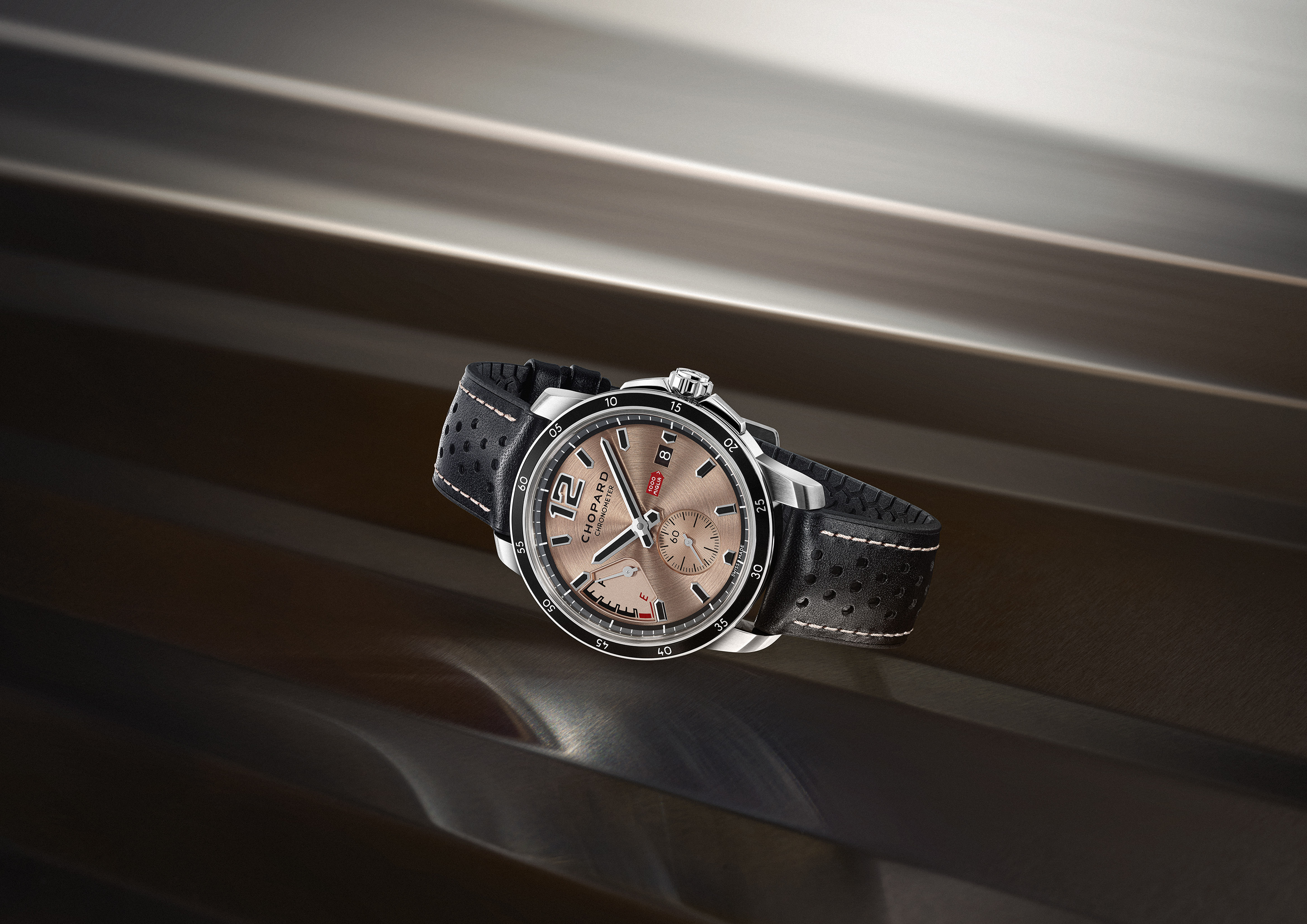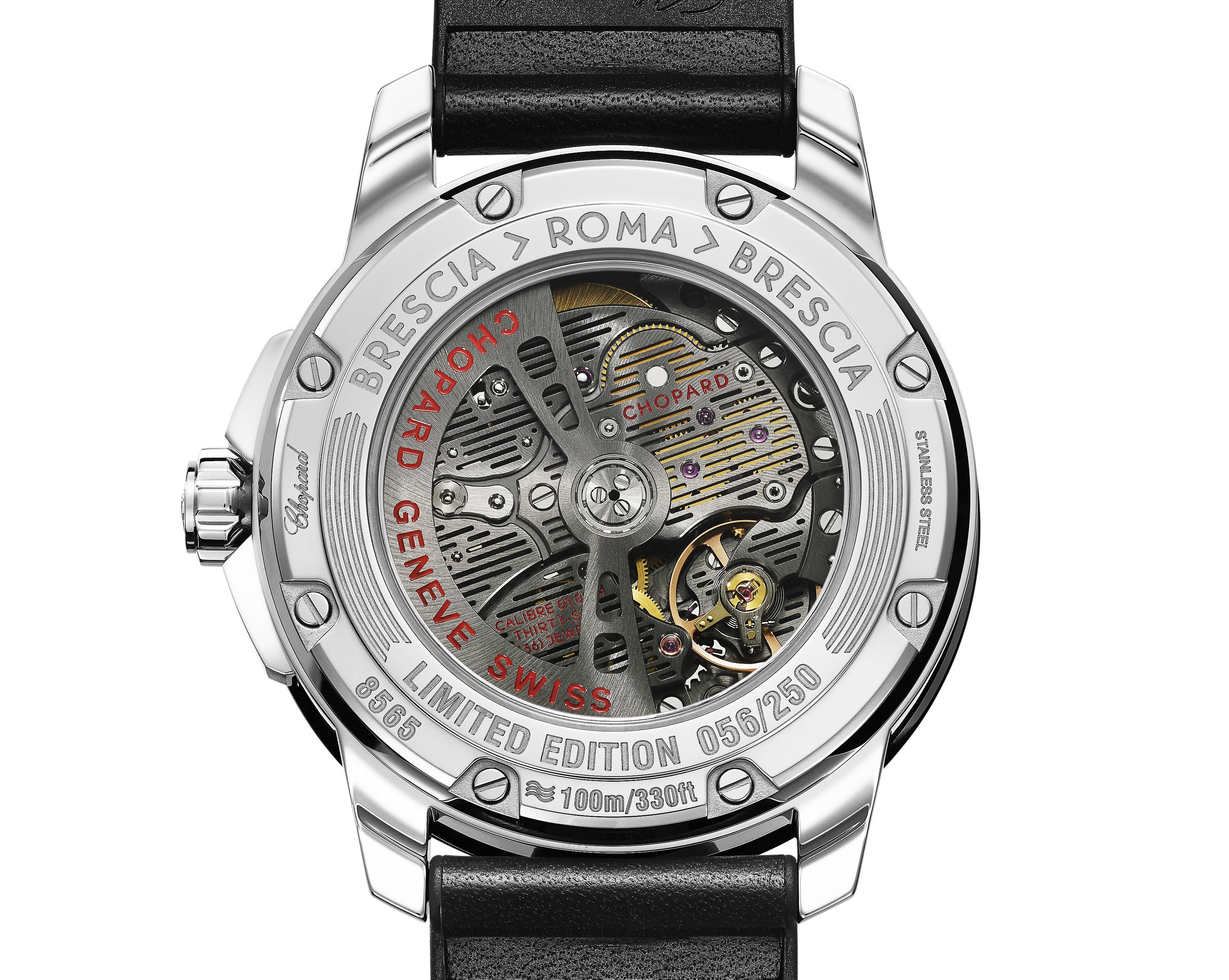 En su interior late el calibre automático Chopard 01.02-M, con certificación de cronómetro COSC, 60 horas de reserva de marcha y un indicador de reserva inspirado en los antiguos marcadores de combustible. La trasera de zafiro revela una masa oscilante con forma de volante vintage, consolidando el tributo al arte de la conducción clásica.