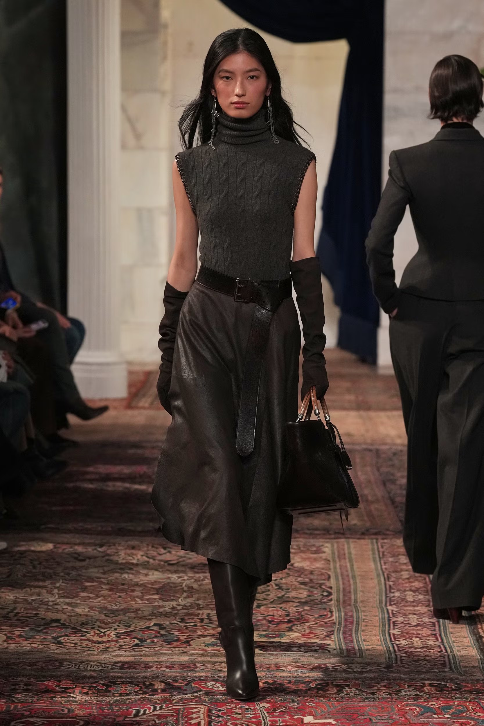 La pasarela se abrió con Gigi Hadid descendiendo la escalera central con  maquillaje mínimo y el cabello deliberadamente imperfecto. Su look, un conjunto de lana marrón con top estructurado tipo bustier superpuesto a un cuello alto gris y falda columna a juego, marcó el tono de la colección. El estilismo se completó con un cinturón de cadena plateada a la cadera y una nueva versión del bolso Ralph, reinterpretado con asas de madera y cuero envejecido.