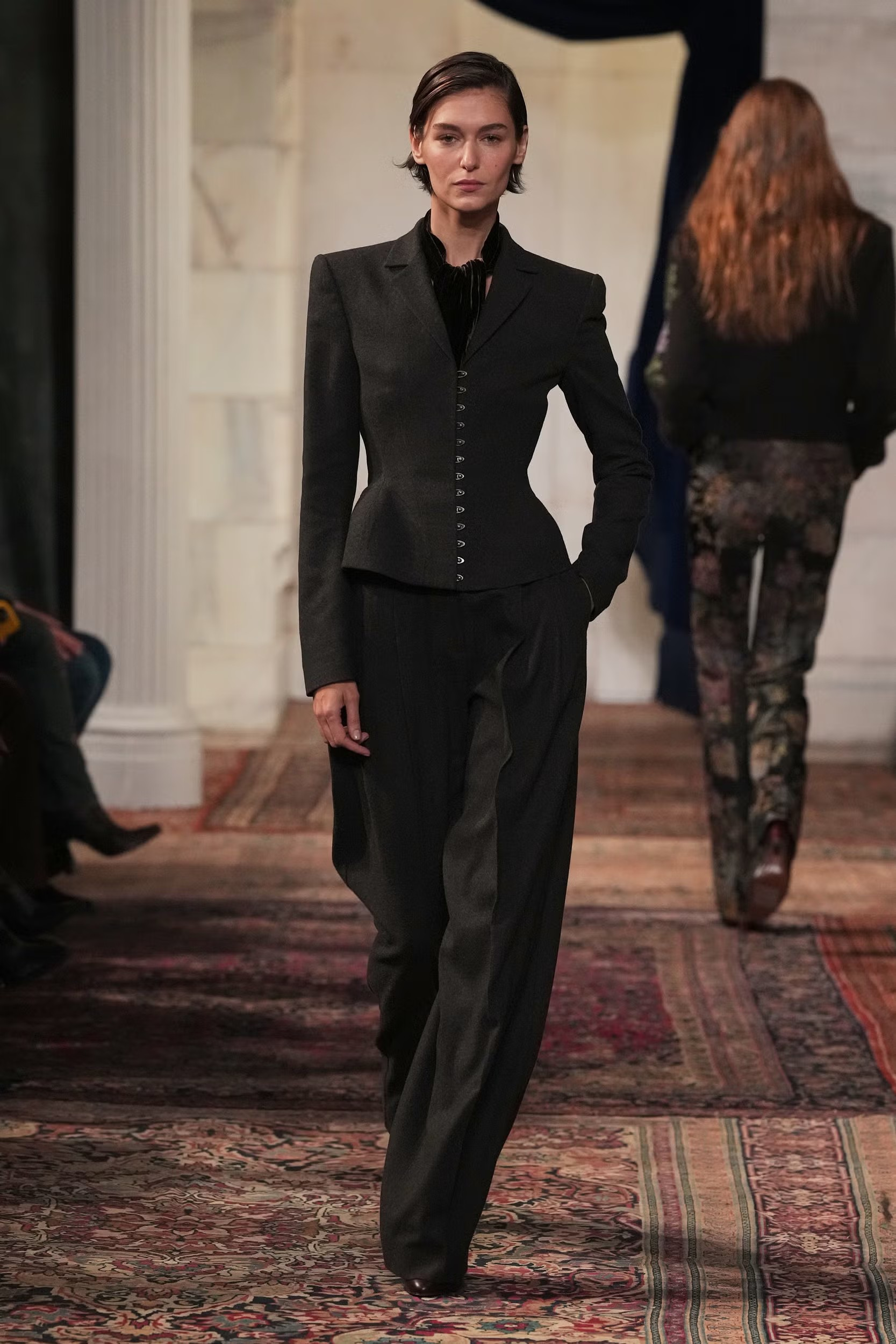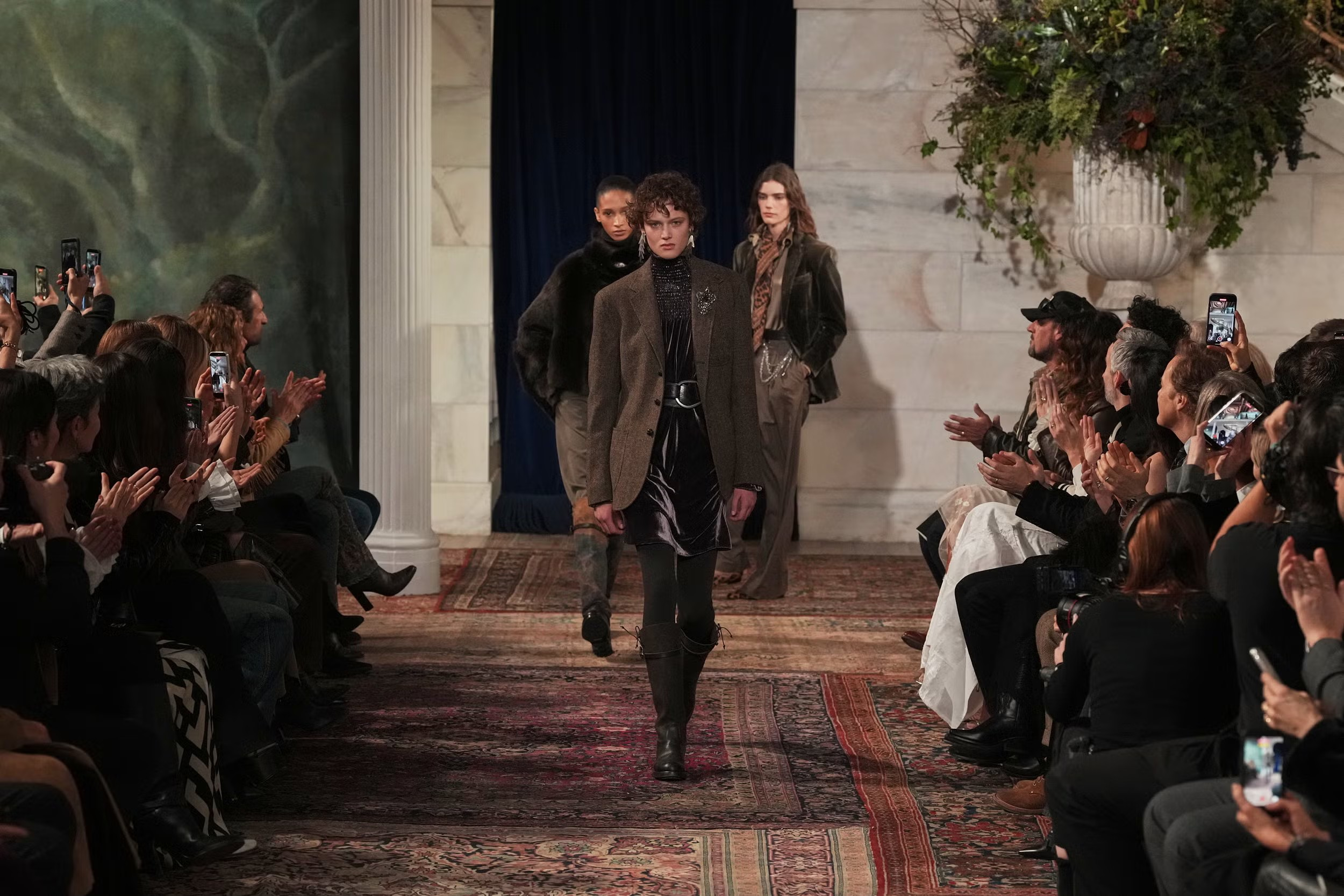 En el marco de la Semana de la Moda en Nueva York, Ralph Lauren eligió la Jack Shainman Gallery como escenario para presentar su colección Otoño 2026, un espacio cuya arquitectura clásica fue transformada en un universo propio de la marca. Columnas de mármol y cielos dorados convivieron con un set pintado a mano que evocaba un bosque nocturno, mientras alfombras orientales cubrían el suelo bajo una selección ecléctica de sillas y bancas vintage, revestidas con telas de la Casa. Una vez más, Ralph Lauren demostró su talento para construir mundos completos, donde el relato que rodea la velada es tan importante como la prenda.