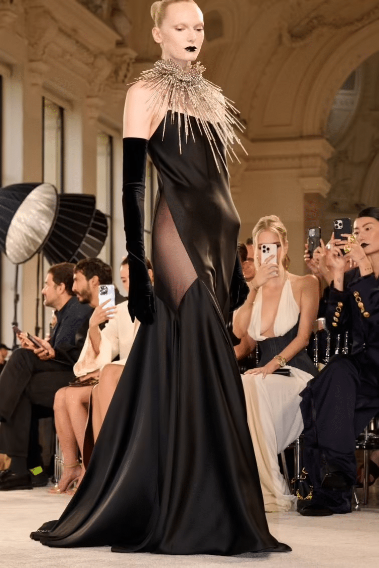 Sobre la pasarela destacó el contraste y la reinvención. Las siluetas se definieron mediante pliegues arquitectónicos, hombros marcados y cinturas ceñidas. Los materiales, desde lana gruesa hasta satín fluido y tul ligero, dialogando con bordados en relieve, perlas barrocas, piezas de resina y aplicaciones metálicas en tonos negro, grafito y plata opaca. Destacaron piezas como la reinterpretación de la capa Apollo con aplicaciones de estrellas metálicas superpuestas, chaquetas de inspiración torera cubiertas de perlas y bordados en pedrería, y vestidos de noche de cortes limpios que actualizan el lenguaje nocturno desde una estética atemporal.